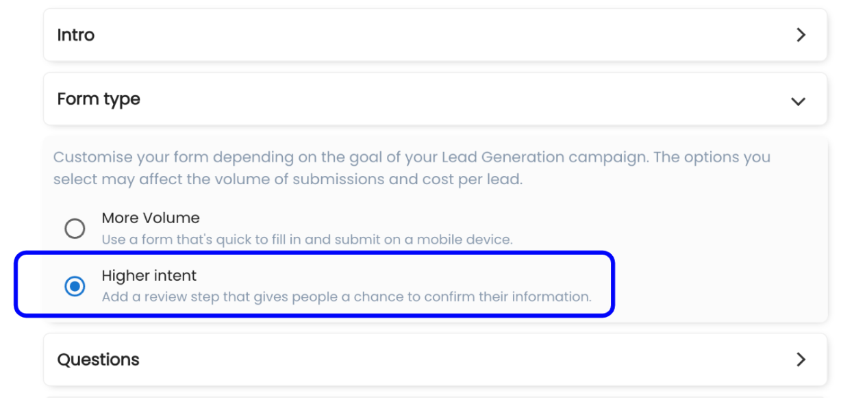 Turn on higher intent for Lead Form Type. You can select between More Volume or Higher Intent depending on the strategy. The second one will give you better quality.